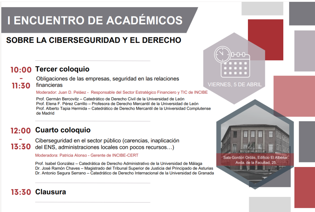 Pablo García Mexía participates in the I Meeting of Academics on cybersecurity and law organized by the National Institute of Cybersecurity (INCIBE), an entity under the Ministry of Digital Transformation and Public Function, through the Secretary of State for Digitalization and Artificial Intelligence, in collaboration with the University of León.